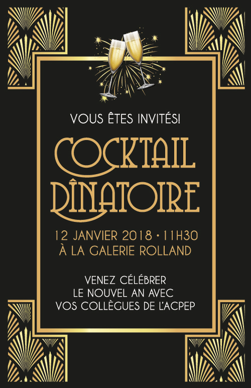12 janvier 2018 Commencez l’année 2018 du bon pied en venant célébrer avec vos collègues de l’ACPEP! Le traditionnel cocktail dînatoire du Nouvel An se tiendra le 12 janvier prochain dès 11h30 à la Galerie Rolland. C’est un rendez-vous!